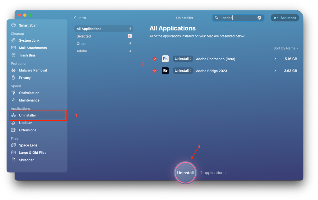 – Mở Cleanmymac lên. Chọn phần Uninstaller> Gõ Adobe vào ô tìm kiếm, xem còn sót bất kì App nào có chữ Adobe thì gỡ ra