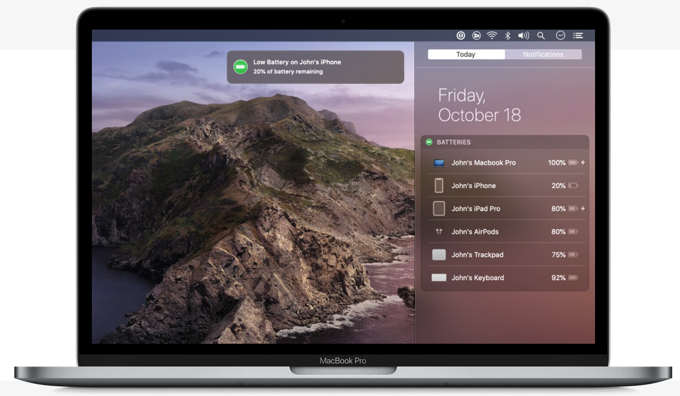 Nó hoạt động với mọi thiết bị Apple chạy bằng pin, như MacBook, iPhone, iPad, bàn phím, chuột, trackpad và AirPods của bạn. Nó cho phép bạn theo dõi các thiết bị này mức pin của Trung tâm thông báo và thậm chí có thể gửi các cảnh báo pin yếu.