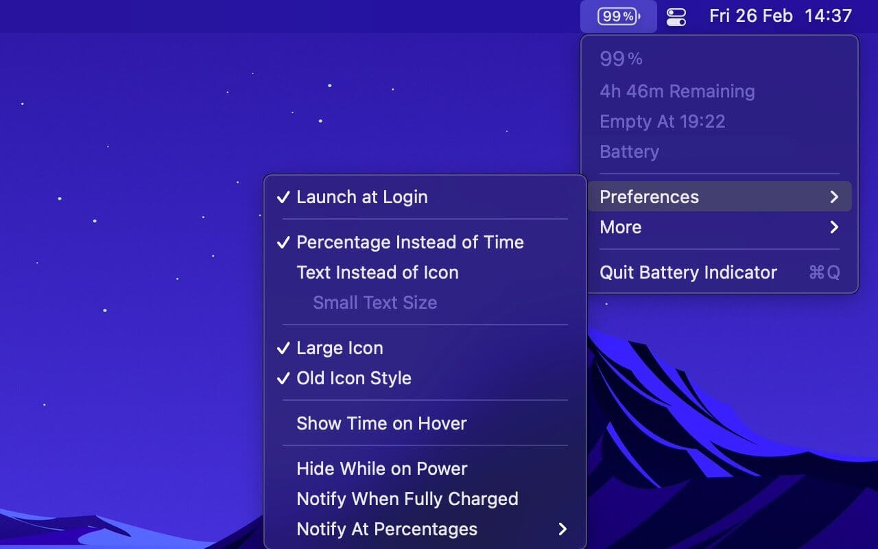 Battery Indicator giúp bạ hiển thị phần trăm và thời gian còn lại của pin trong thanh menu. Ứng dụng có một cài đặt để ẩn biểu tượng thanh menu khi phích cắm điện được kết nối, điều này có thể hữu ích nếu bạn chỉ quan tâm đến thời gian / phần trăm pin khi không cắm sạc.