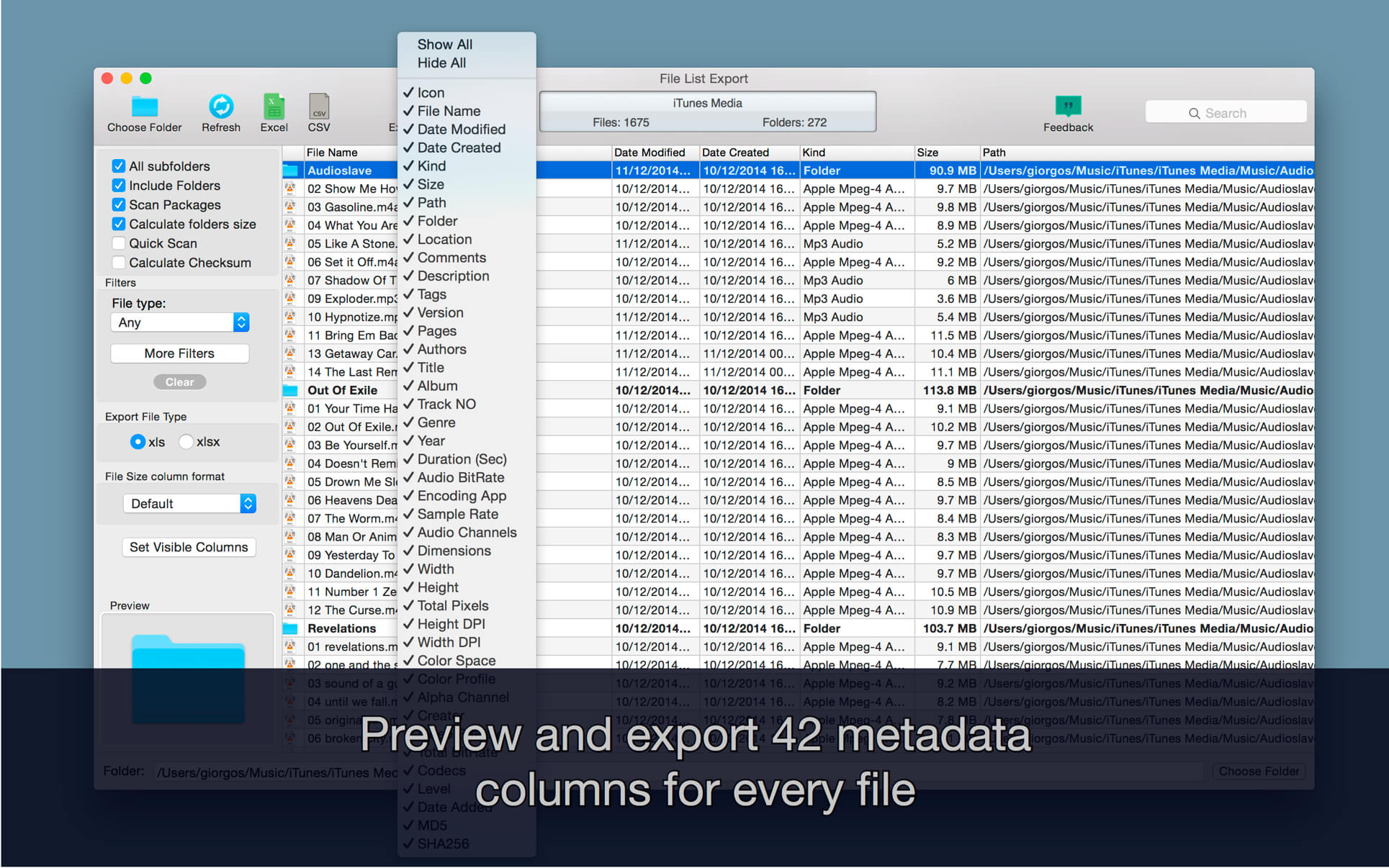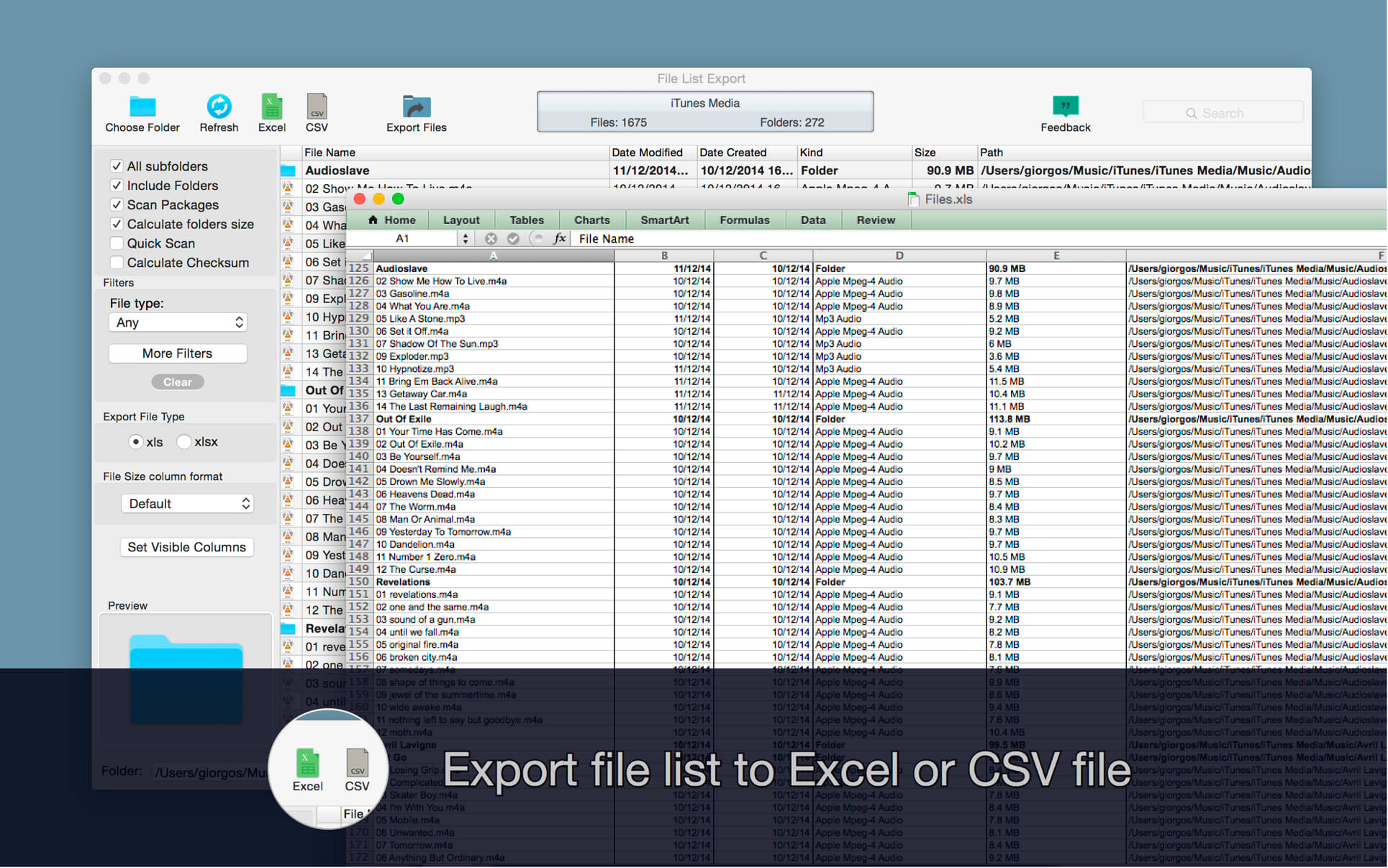 Chỉ cần chọn một thư mục hoặc kéo vào phần mềm để có được danh sách với tất cả các tệp và thư mục sang Excel hoặc tệp CVS. Bạn có thể chọn nếu bạn muốn bao gồm các tệp từ tất cả các thư mục con. Xem trước và chỉnh sửa danh sách trước khi xuất ra tệp. Dễ dàng tìm kiếm và lọc các bản ghi danh sách file.