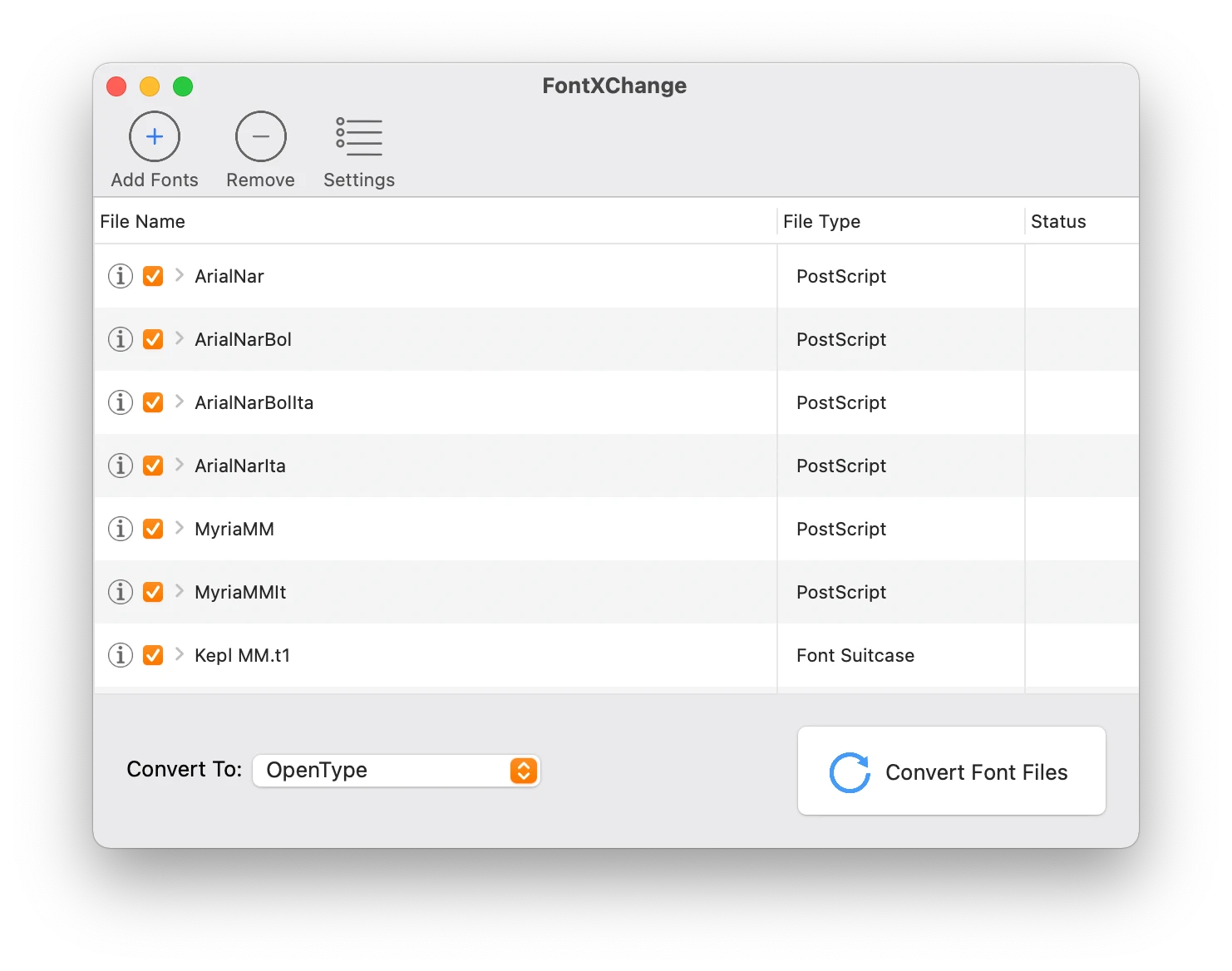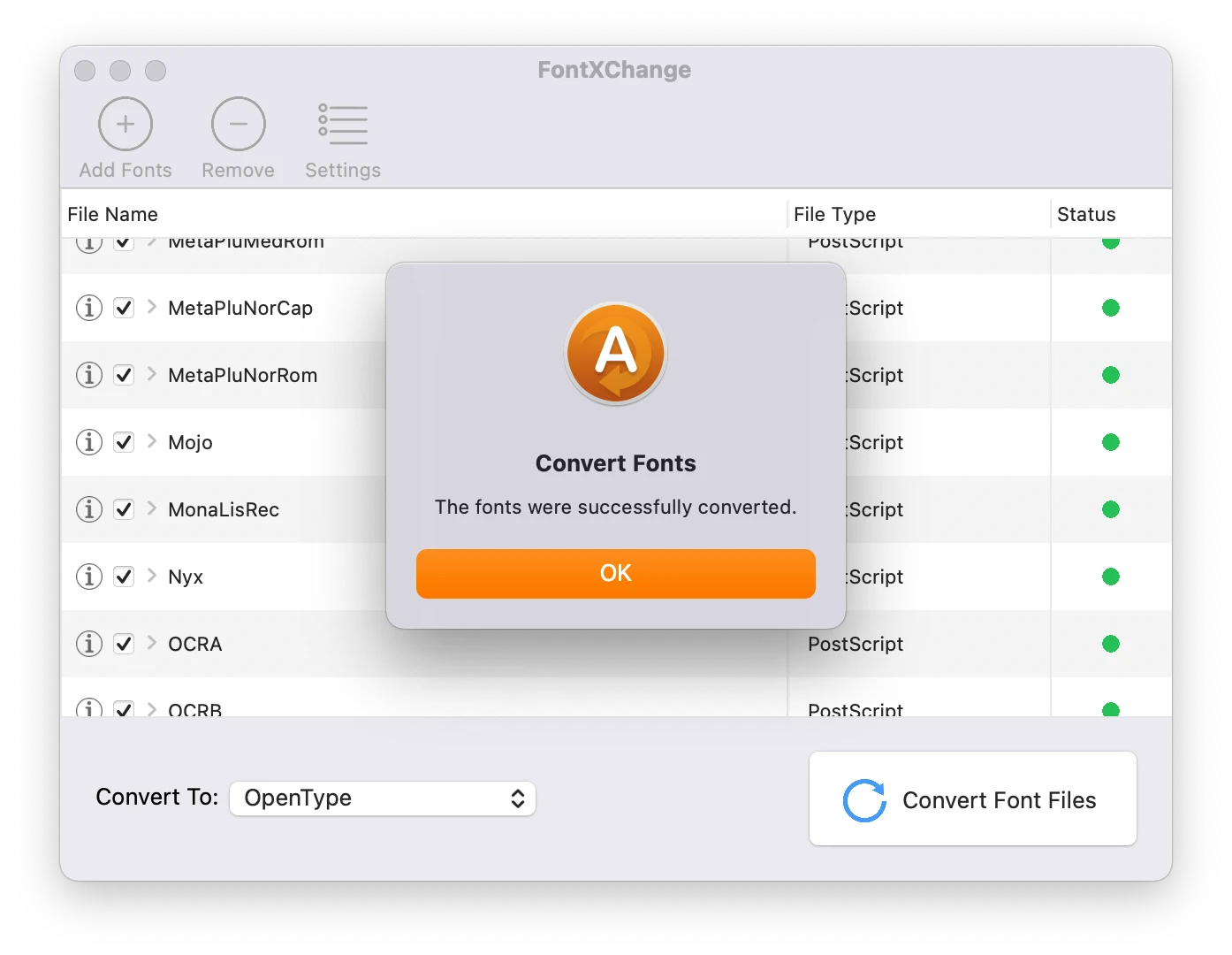 FontXChange có thể dễ dàng chuyển đổi phông chữ sang OpenType (PS), PostScript Type 1 và TrueType cho cả Mac hoặc Windows. FontXChange được thiết kế để hiểu nhiều định dạng phông chữ khác nhau và có thể chuyển đổi phông chữ thành nhiều định dạng khác nhau.