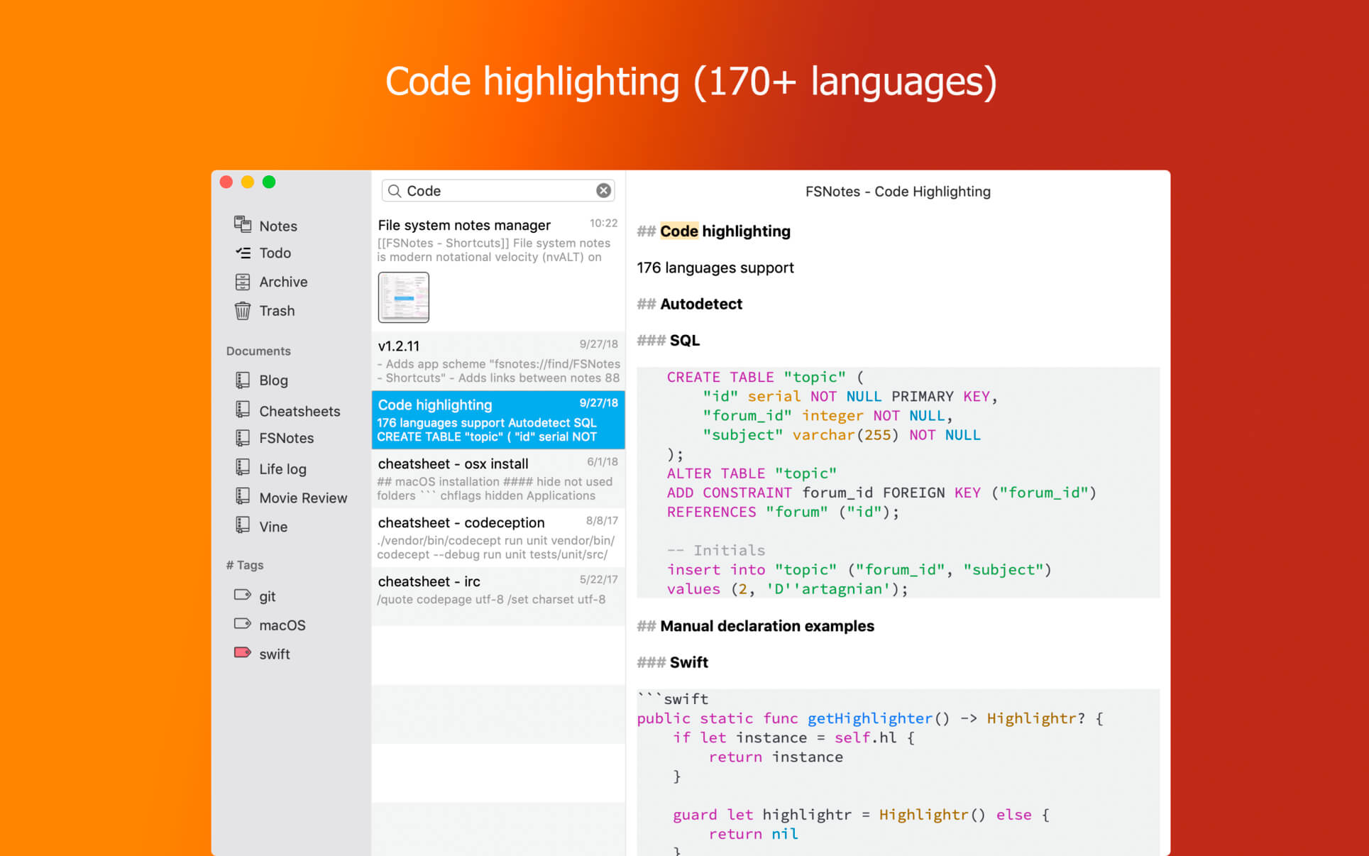 FSNotes là ứng dụng tạo và quản lý ghi chú trên máy tính Mac mà không cần sử dụng chuột. FSNotes for Mac lấy cảm hứng từ ứng dụng Notational Velocity khá nổi tiếng, được phát triển bằng ngôn ngữ lập trình Swift của Apple và được bảo vệ dữ liệu với Sanbox.