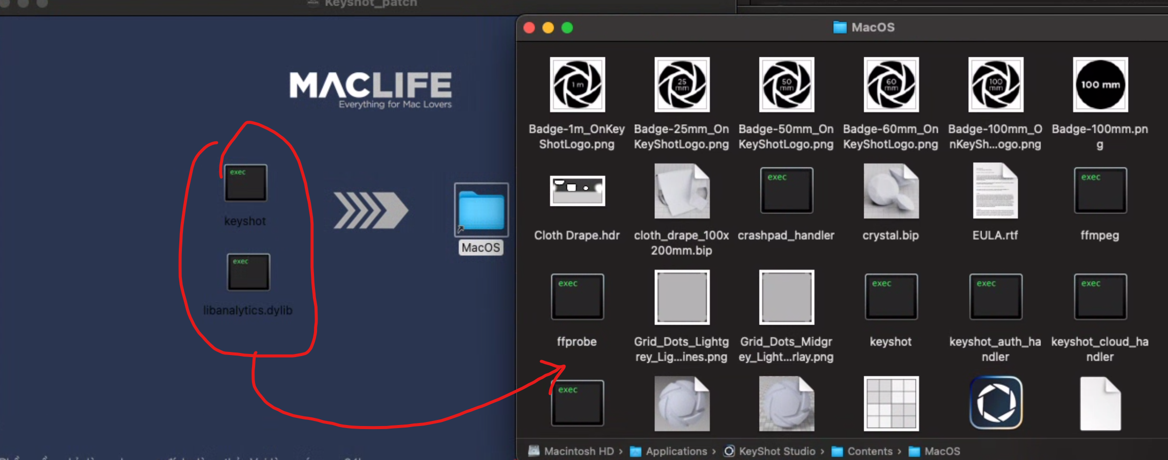 Bước 2: Mở file Keyshot_Patch, mở thư mục macOS kế bên và chép đè 2 file vào thư mục này