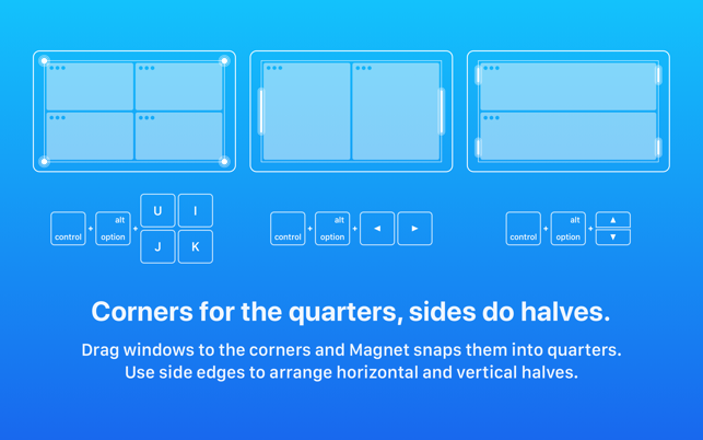 Magnet sẽ thay đổi cách bạn làm việc với các cửa sổ trên Mac. Bạn có thể dễ dàng snap 1 cửa sổ bất kỳ vào các kích thước và vị trí khác nhau bằng cách kéo và thả vào các góc màn hình. Bạn cũng thể cho hiển thị 4 cửa sổ đều nhau trên màn hình trong nháy mắt.