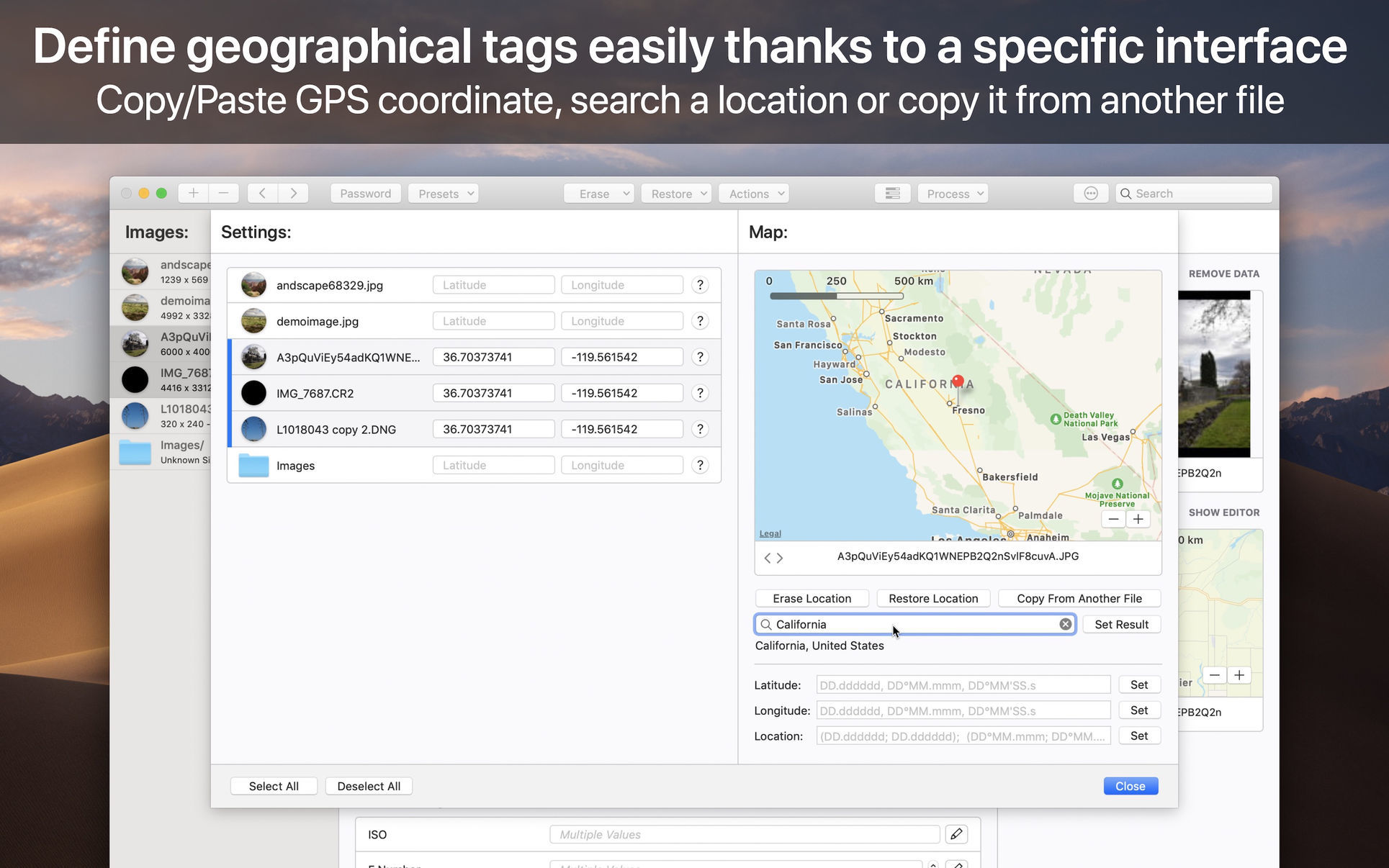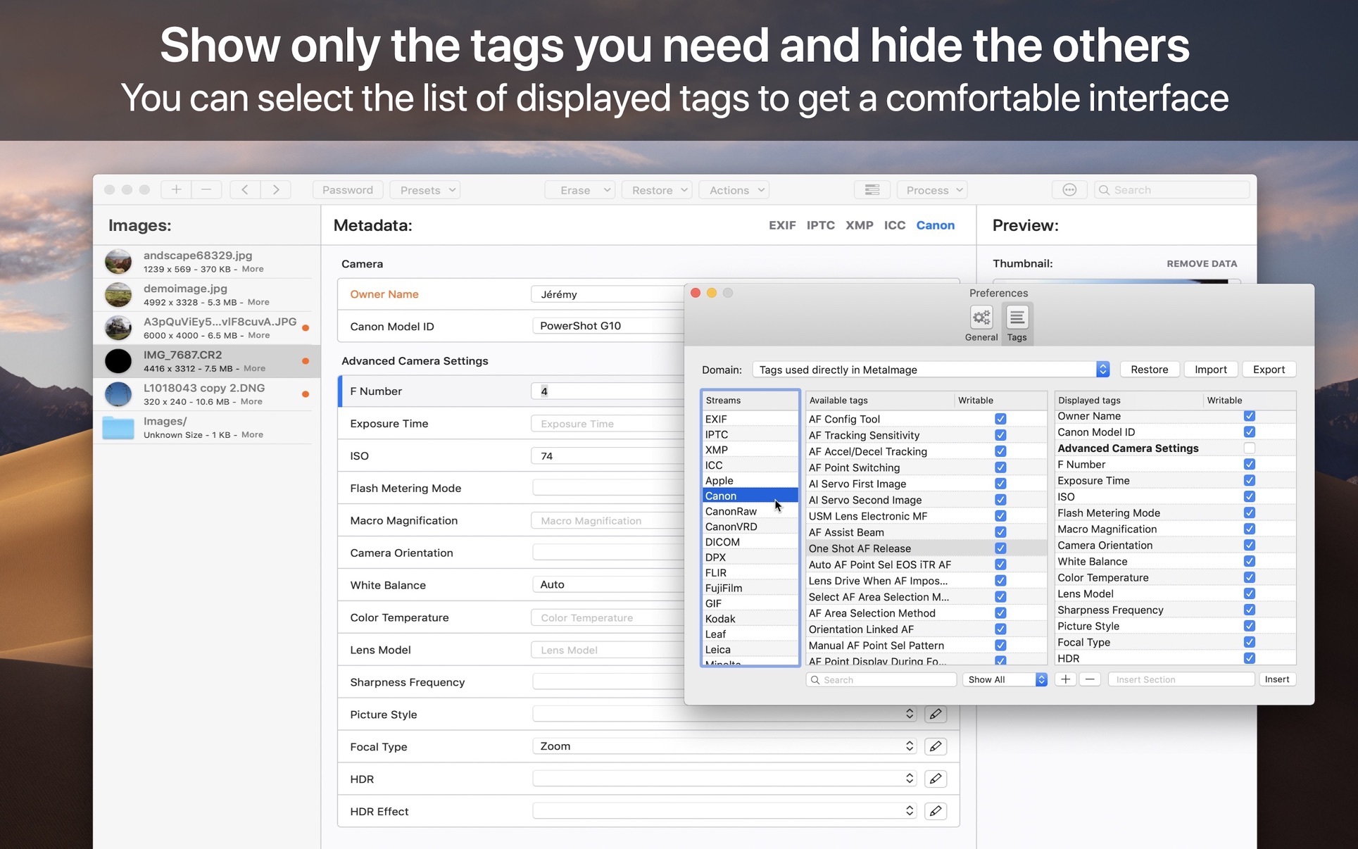 The application is designed for professional needs. More than 90 image formats are supported (MOS, CR2, DNG, NEF, NRW, JPEG, PNG, TIFF, RAW, and much more). MakerNotes tags may be edited but not created or deleted. This avoids many potential problems with OEM software.