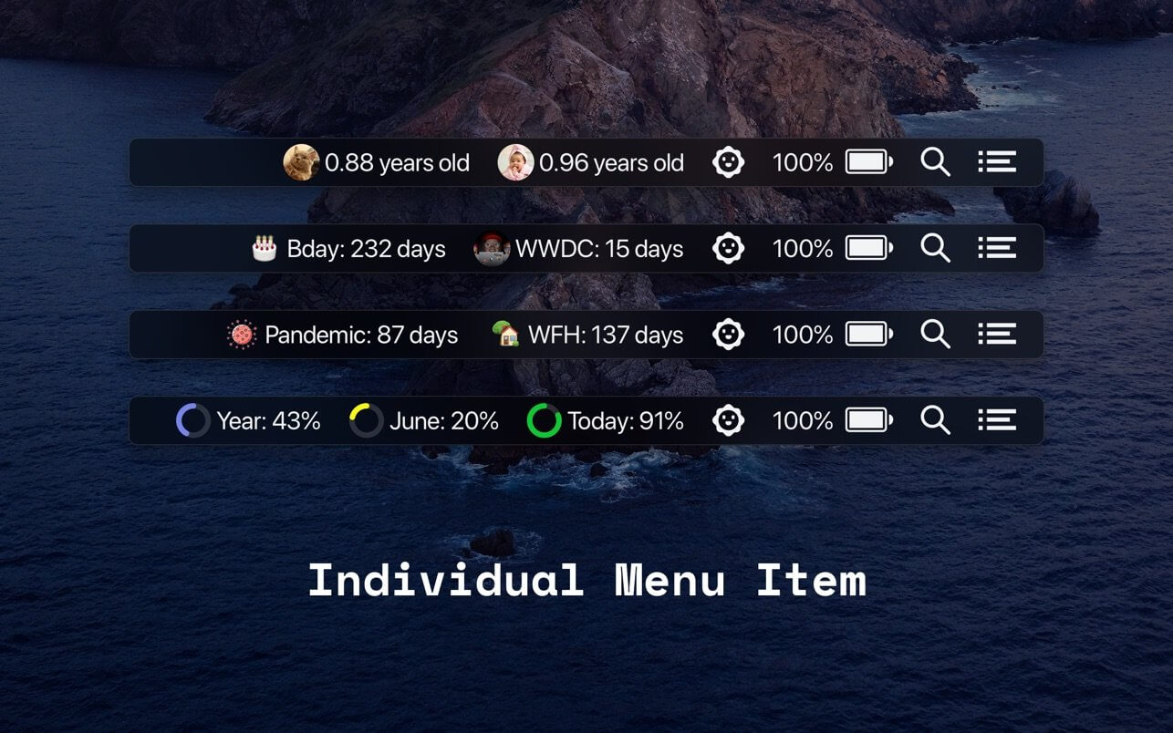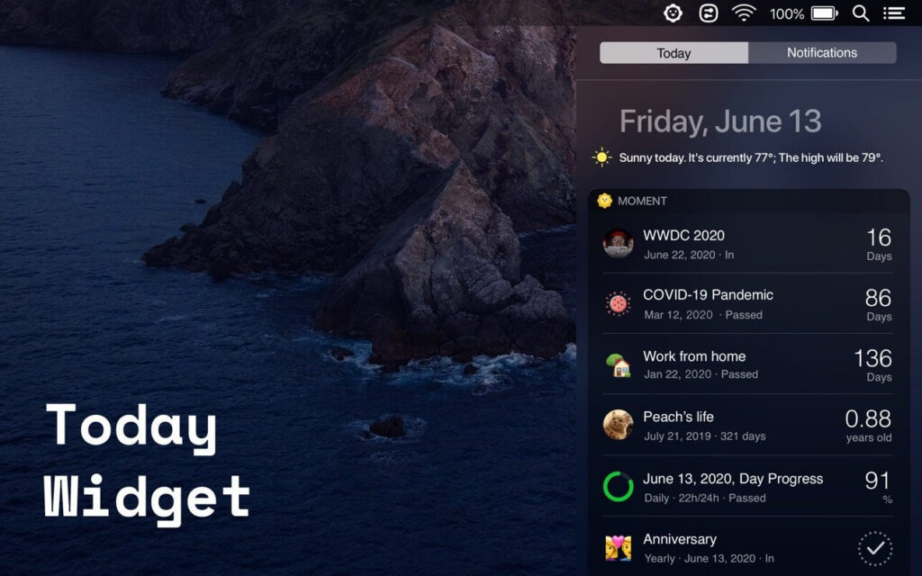 • Menu Bar and Today Widget Every single event can be added to the menu bar as an individual menu item. Take a peek of your events at Notification Center today widget, without even opening the app.