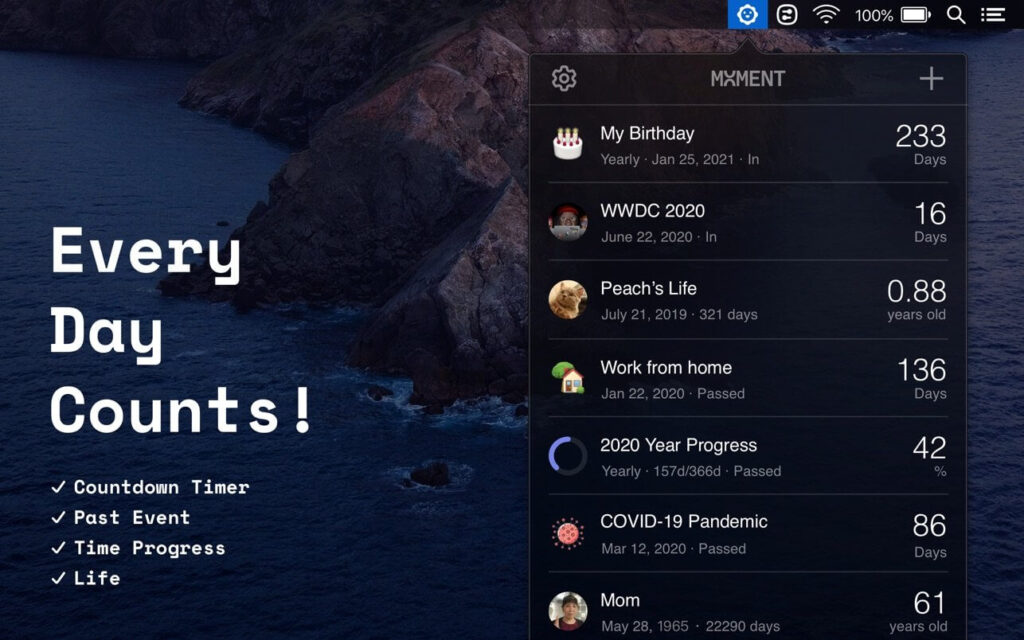Moment là ứng dụng đếm ngược các sự kiện sắp tới ngay trên Menu và Trung tâm thông báo để giúp bạn nhớ lại những ngày đáng nhớ nhất