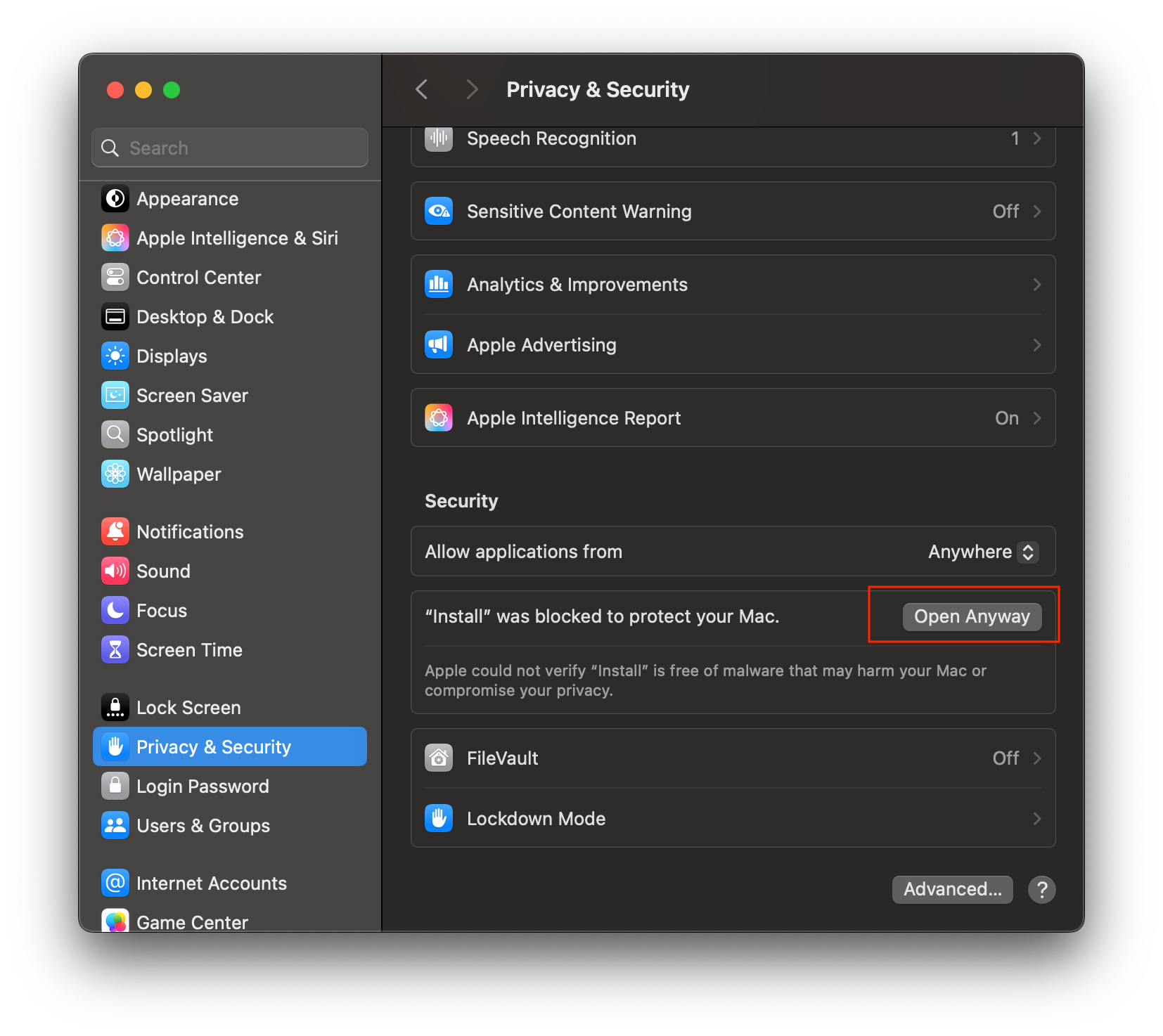 Bước 2: Vào System Setting> Security & Privacy> chọn Open Anyway> Chọn tiếp Open Anyway