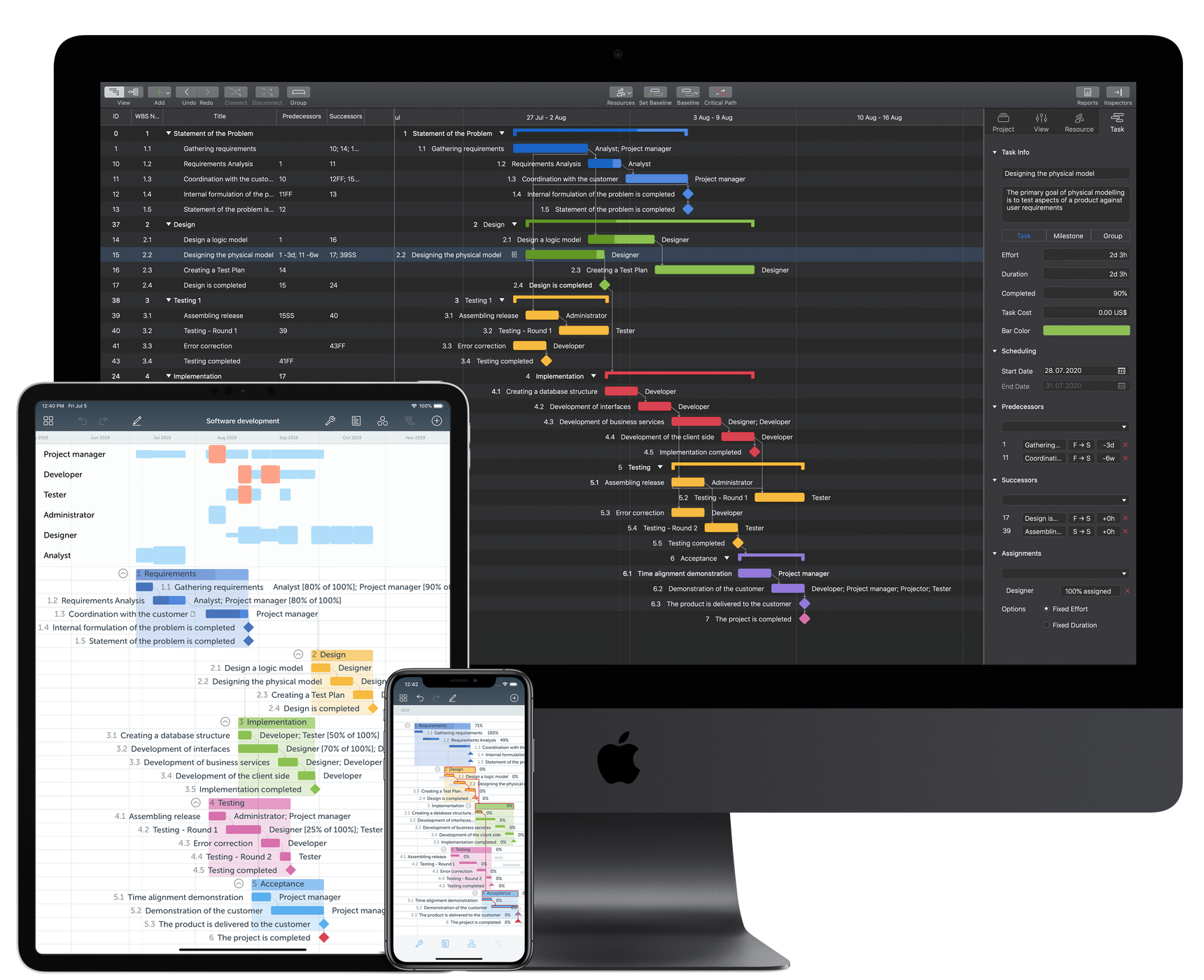 – Add resources to your project: people or materials, modify work hours, identify bottlenecks, distribute workloads fairly and create a realistic plan