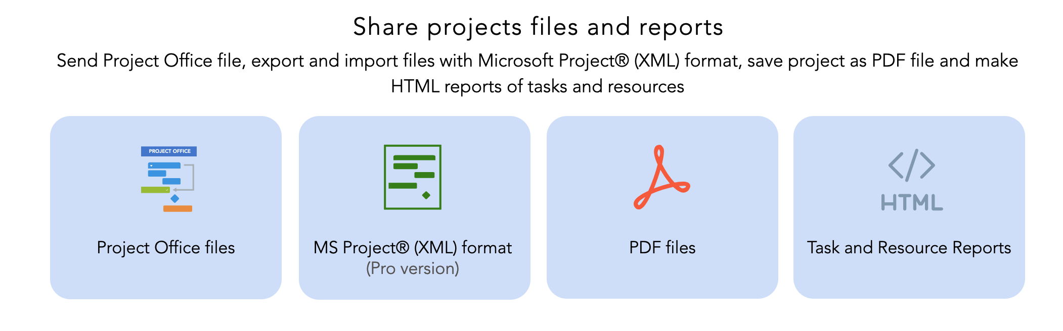 – Send Project Office file, export and import files with Microsoft Project® (XML) format, save project as PDF file and make HTML reports of tasks and resources