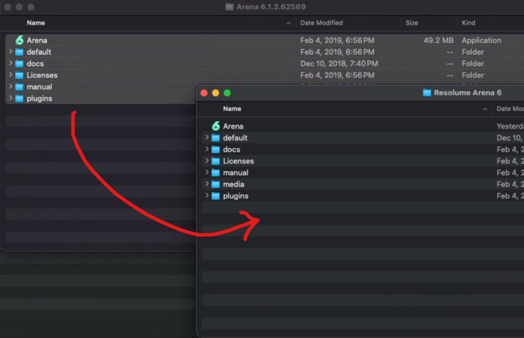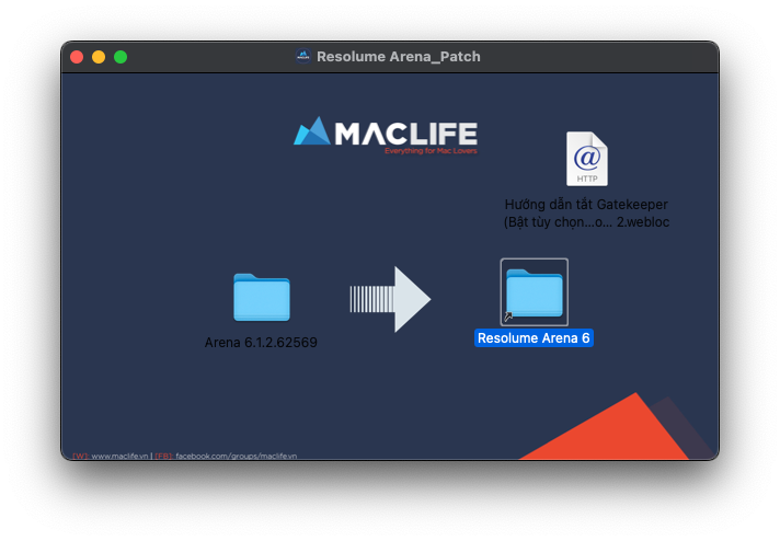 Sau khi cài xong, mở file Resolume Arena_patch.dmg. click đúp vào thư mục Arena 6.1.2.62569 để mở ra.