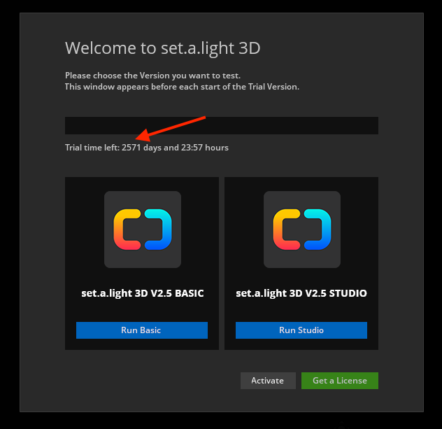 5. Chỉnh lại ngày giờ về hiện tại, sau đó chạy mở App lên lại, bạn sẽ thấy màn hình báo Trial còn vài ngàn ngày như hình. Chọn vào Run Studio để xài ít nhất là được tới năm mà bạn đã chỉnh ở bước 1.