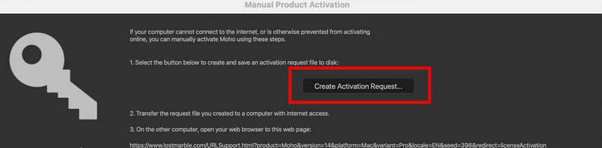 Màn hình tiếp theo sẽ tạo ra file Moho_ActivationRequest.txt> chọn lưu file này ngoài Desktop cho dễ