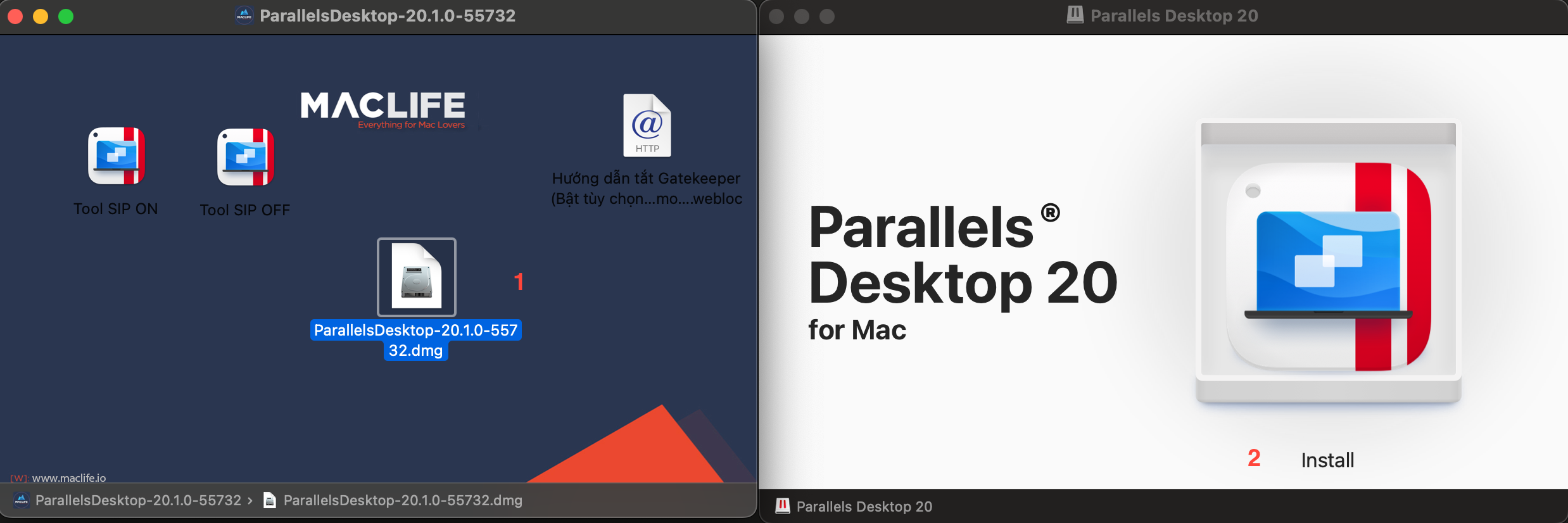 – Mở file cài Parallel Desktop đã tải ở mục I.1 về, mở file dmg ở giữa rồi chạy file Install để cài như bình thường