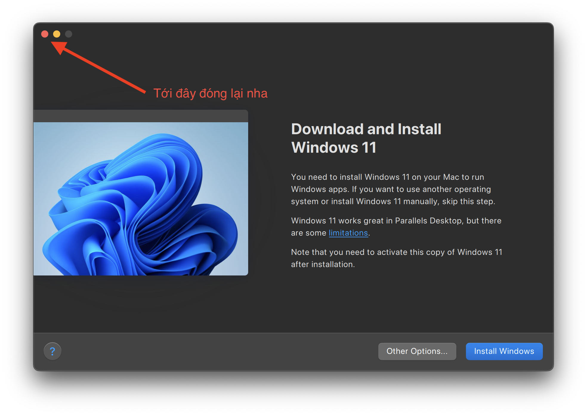Chạy cài tới lúc gặp màn hình đòi cài Windows như này thì đóng lại.