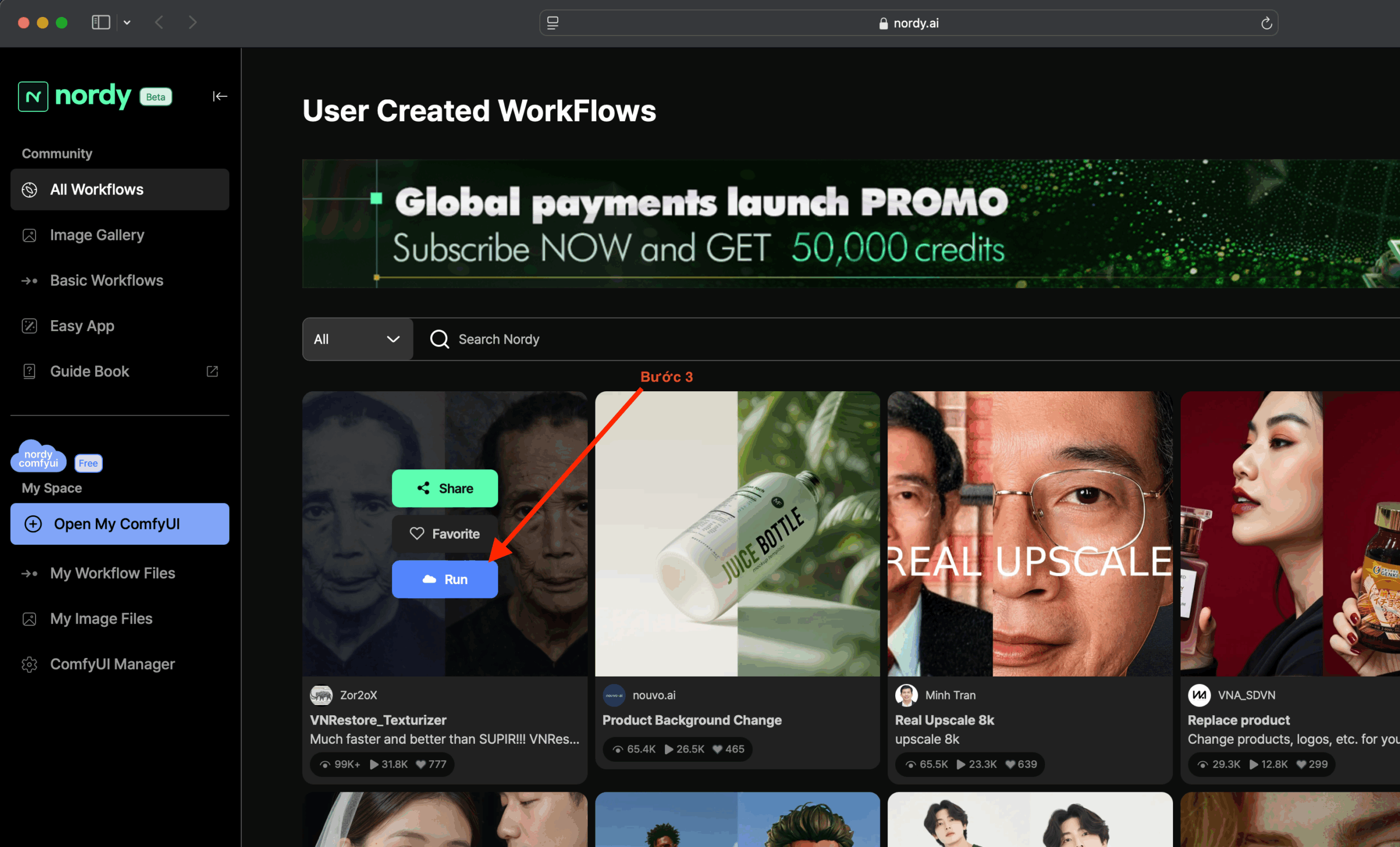 Bước 3: Trở lại trang chủ Nordy. Rê chuột lên Workflow trong hình, chọn Run hoặc nhấn vào đây để mở Workflow phục hồi ảnh: maclife.vn/phuchoianh