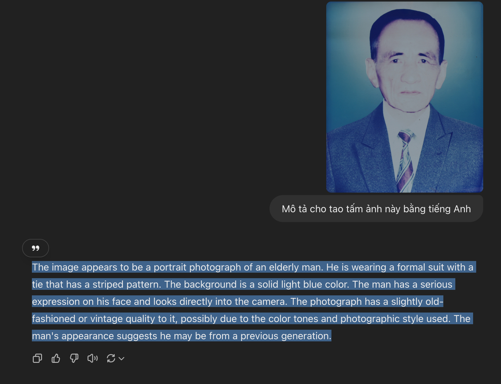 Ô số 1: Anh em up tấm ảnh cần phục hồi lên chatgpt nói nó: Mô tả cho tao tấm ảnh bằng tiếng Anh. Sau đó copy đoạn mà ChatGPT mô tả dán vào ô số 1