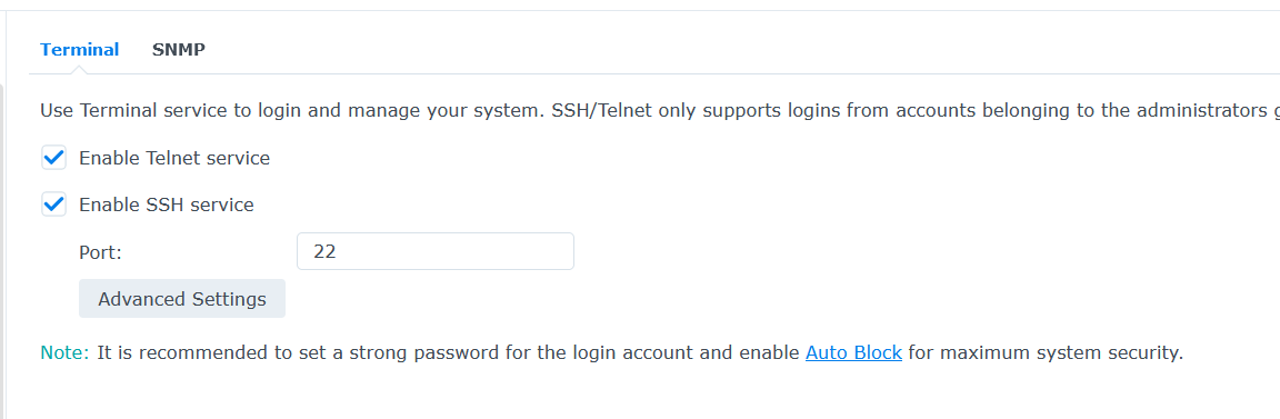 Đăng nhập vào NAS, vào Control Panel, tìm đến Terminal & SNMP