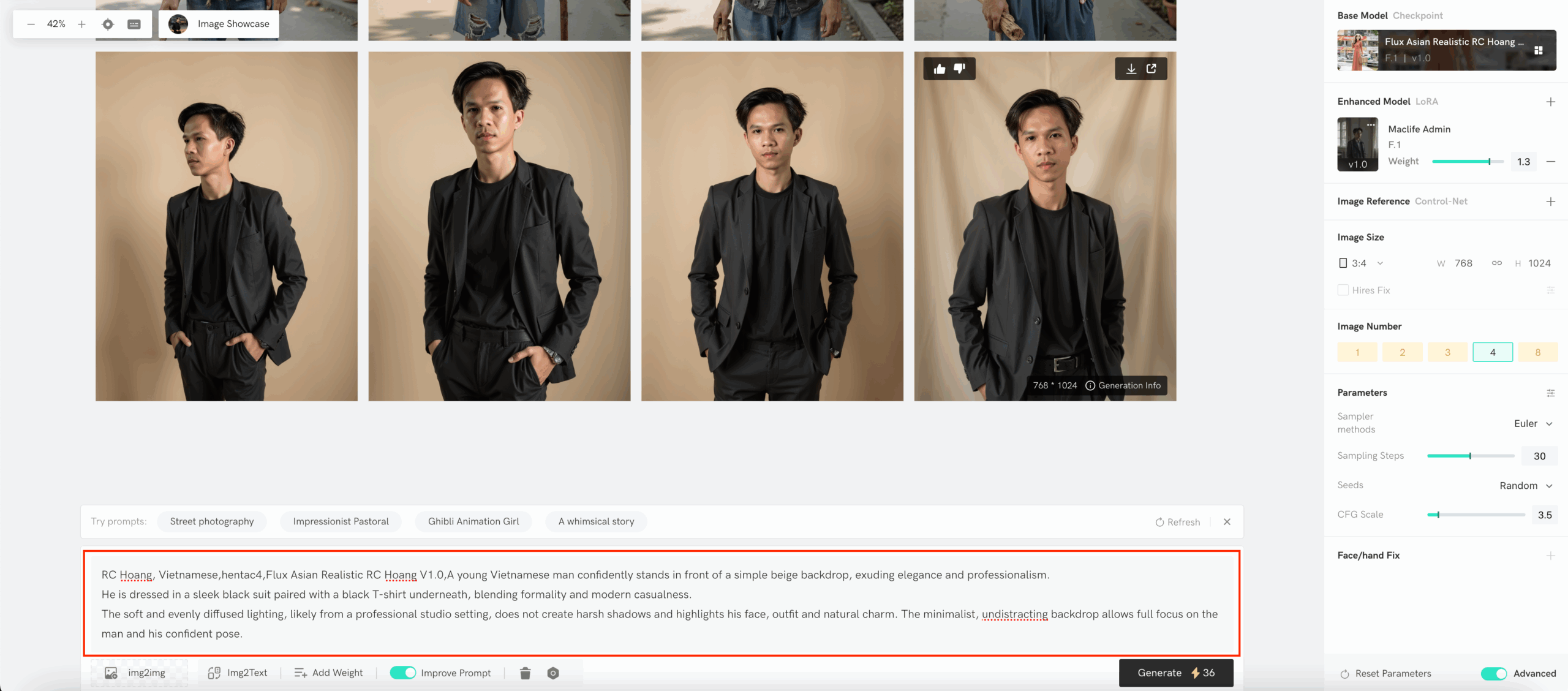 Phần Enhanced Mode LoRA: Nhấn dấu cộng và gõ tên Của model mà anh em đã Train và Publish ở bước 1. Weight: Trọng số này anh em nên để lớn hơn 1. Thường mình để 1.3-1.5. Ảnh sẽ ra giống mặt anh em nhất.