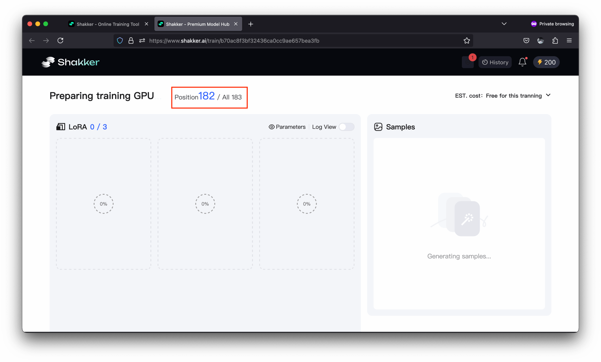 Sau đó nhấn Start> Bạn sẽ được chuyển qua màn hình Preparing traning GPU. Như hình là Lora của mình đang phải đợi tới 182 người nữa mới tới. Kinh nghiệm của mình là thao tác Train a Lora vào buổi sáng tầm khoảng 5-9h thì sẽ tới lượt luôn mà không cần đợi ai. Buổi chiều và tối thường sẽ xếp hàng khá lâu.