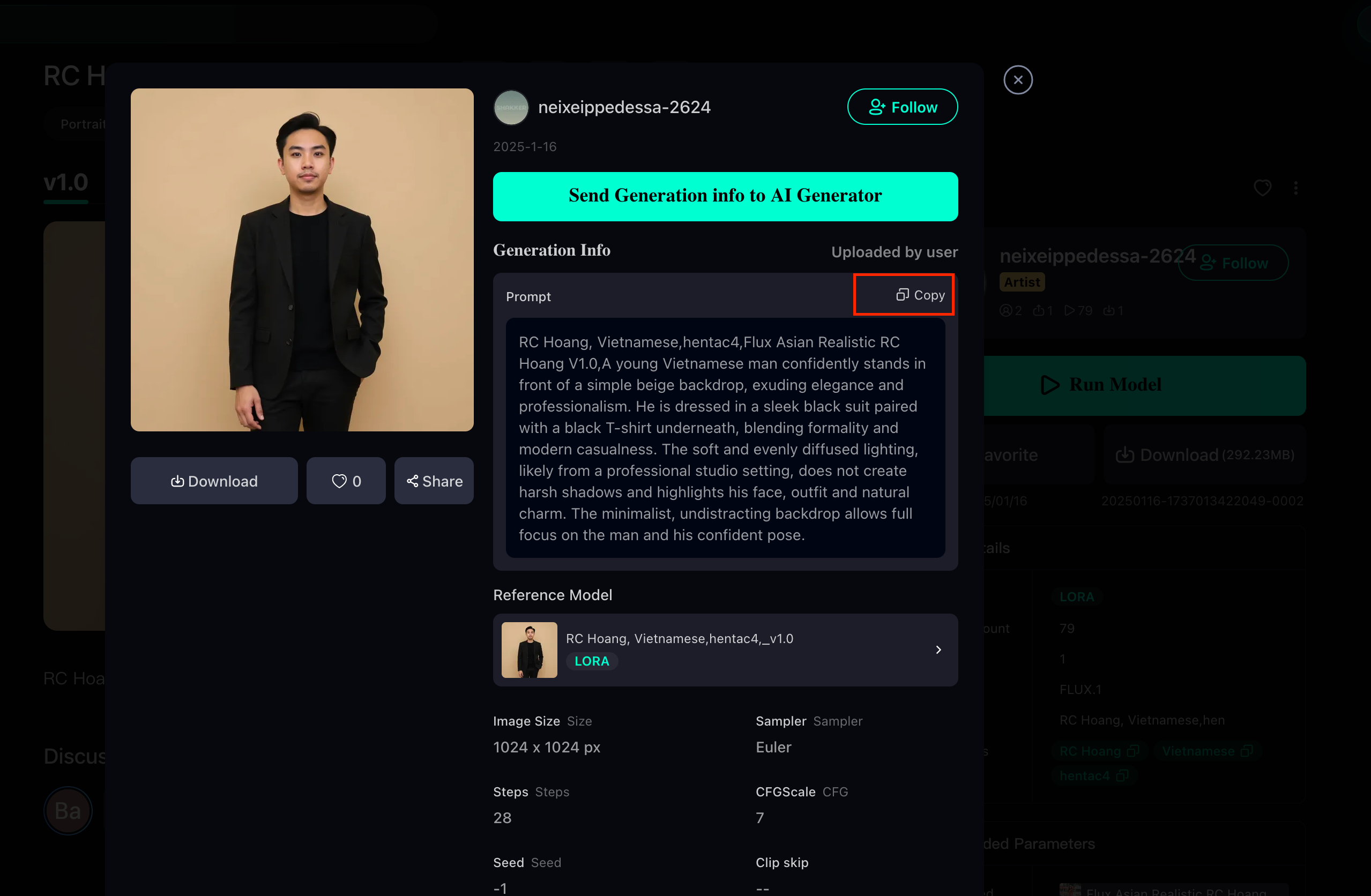 Phần Promt: Có nhiều cách để anh em có thể kiếm Promt phù hợp. Cách dễ nhất là anh em lượn 1 vòng trên Shakker.ai. Thấy hình nào thích và muốn tạo hình tương tự. Anh em chỉ việc mở hình đó, copy Promt và dán vào mục Promt. Ví dụ mình lượng thử trên Shakker thấy hình này. Mình mở lên, nhấn vào Copy