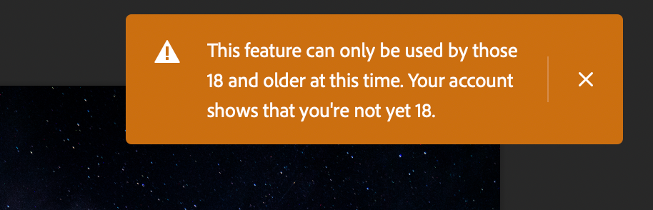 Lỗi này nó ghi thông báo khá rõ rồi đó. Tài khoản chưa đủ 18 tuổi ko cho cài tính năng Generate Fill (và một số tính năng khác). Fix bằng cách đăng ký tài khoản khác, nhập năm sinh sao cho trên 18 hoặc chỉnh lại độ tuổi nếu login bằng Gmail (công khai tuổi). Có 1 cách khác được anh em chia sẻ là behance.net xong đăng nhập adobe vào. Nó cho chọn ngày sinh. Để đủ 18 tuổi là được.