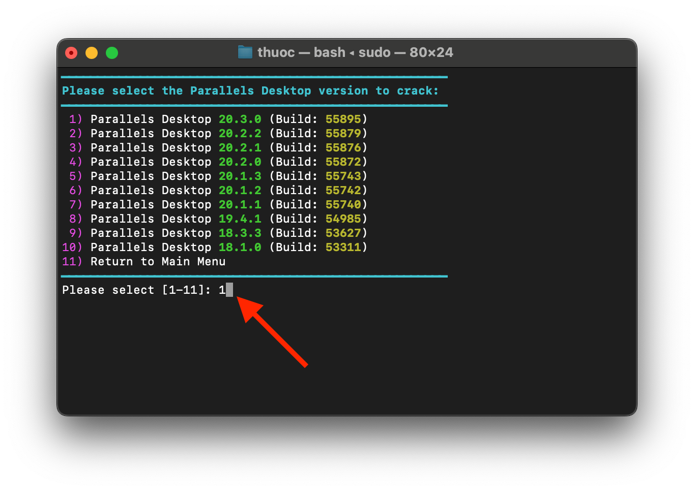 Chạy lệnh xong nhập mật khẩu đăng nhập máy (lưu ý lúc nhập không hiện gì đâu, cứ nhập đúng là được). Sau đó chọn 1 – 1 như hình: