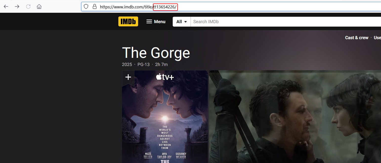 2. Lên imdb tìm phim cần xem, ví dụ mình tìm The Gorge thì nó ra link của của The Gorge trên imdb như này: www.imdb.com/title/tt13654226/
